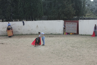 | Los participantes en la plaza de tientas de la ganadería de Vasconcellos. |